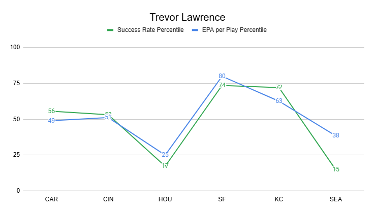 The actual excuse for Lawrence last week was that the Seahawks' pass rush exposed the Jaguars' offensive line. The Jaguars have protected very well this year, but against a pretty soft pass rush schedule. Houston is the only other strong pass rush they've faced. And last week, the Seahawks took advantage of Lawrence's longer time to throw, generating a 54% pressure rate. Only the Broncos (59%) in their demolition of Justin Fields posted a higher pressure rate last week.