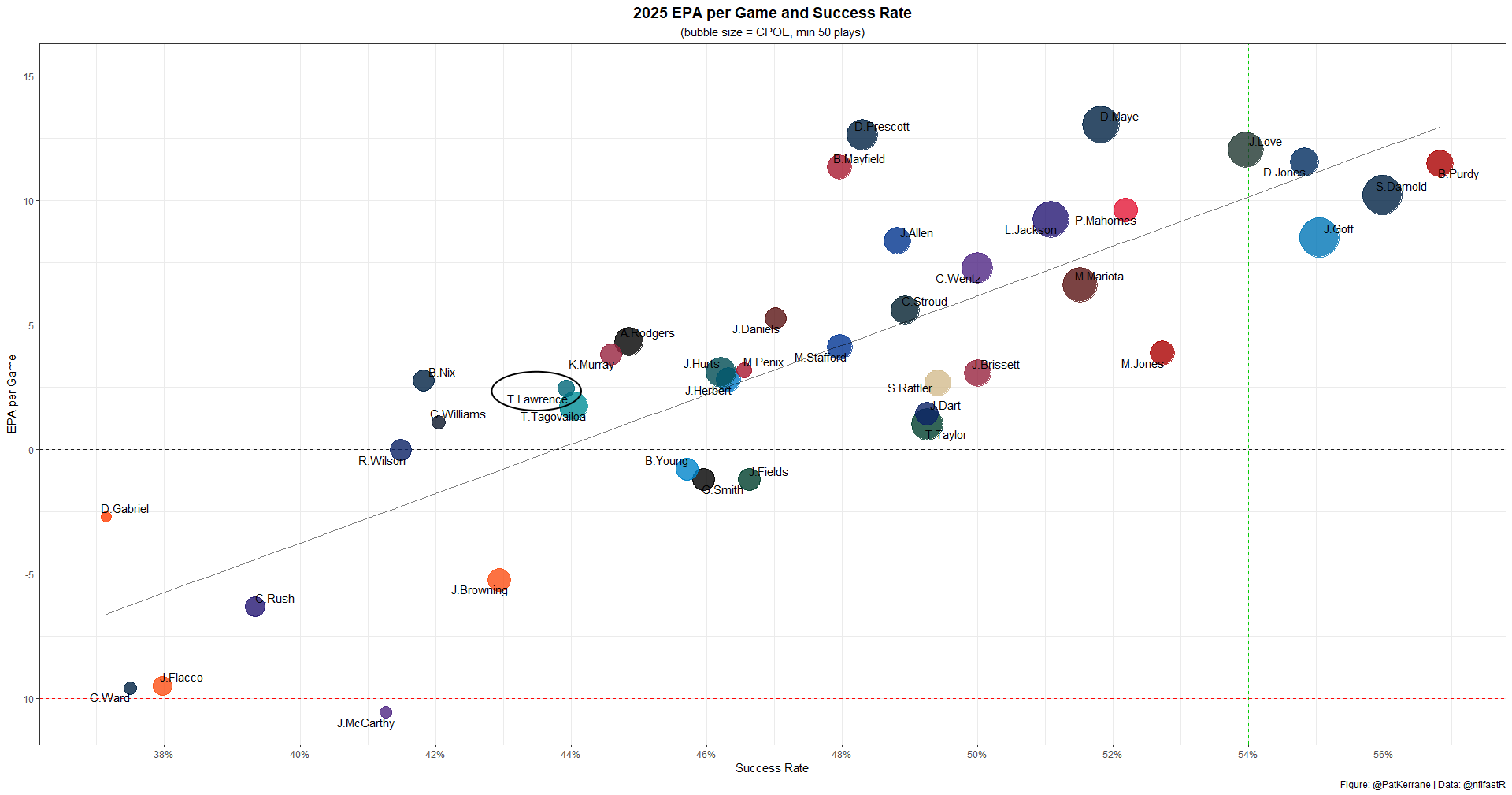 Lawrence hasn't been awful this year, but on the EPA chart, he's in the QB purgatory zone, joined by Tua Tagovailoa, Kyler Murray, Aaron Rodgers, Bo Nix, and Caleb Williams. These QBs are all turning in acceptable-ish efficiency, averaging between 1.1 and 4.3 EPA per game. But they also have weak success rates between 42% and 45%. For his part, Lawrence is at 2.4 EPA per game and a 44% success rate. At that level of inconsistency, it's fair to wonder if a guy is really the answer at the game's most important position.