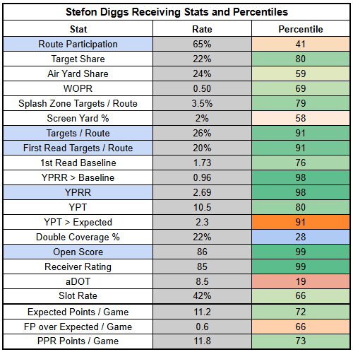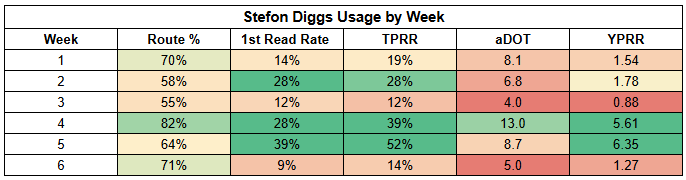 Stefon Diggs is coming off a quiet week, but his 71% route participation was quietly his second-highest mark of the year.