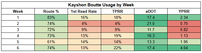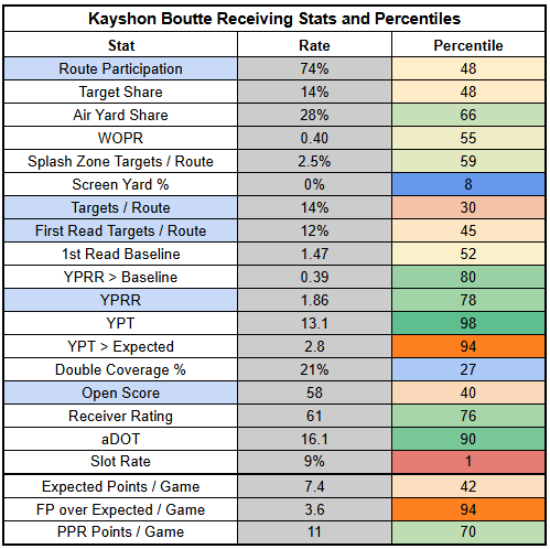 Kayshon Boutte spiked for two TDs against the Saints, but his target profile was in line with where it usually is.