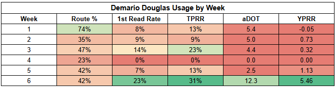 Demario Douglas should have had a multiple-TD day against the Saints, but he is still in a rotational role. He's not a viable play.