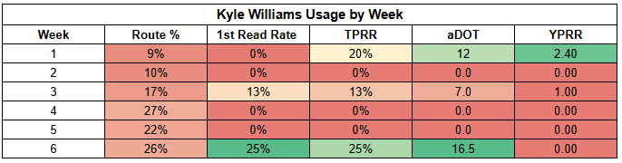 Kyle Williams' per-route usage spiked last week—he's worth adding in deep leagues as a bet that his role grows in the coming weeks. Odds are you'll throw him back, but the Patriots could use another playmaker, and he appears to be in a downfield role.