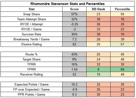TreVeyon Henderson has been worse than Stevenson. Henderson has just a 31% success rate; only Alvin Kamara and Christian McCaffrey have been worse. Maybe in 10 years, Jahmyr Gibbs will look like this version of Henderson, too, and the Henderson/Gibbs comps will finally hit.