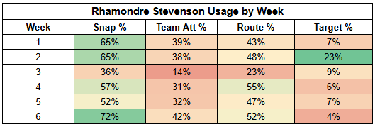 In the backfield, things remain split. Rhamondre Stevenson saw a season-high 72% snap share, but still handed just 42% of carries against the Saints. That was also a season high, actually, but still well below ideal for a starting RB.