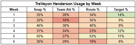 TreVeyon Henderson was on the field less but still saw his usual allotment of carries and targets.