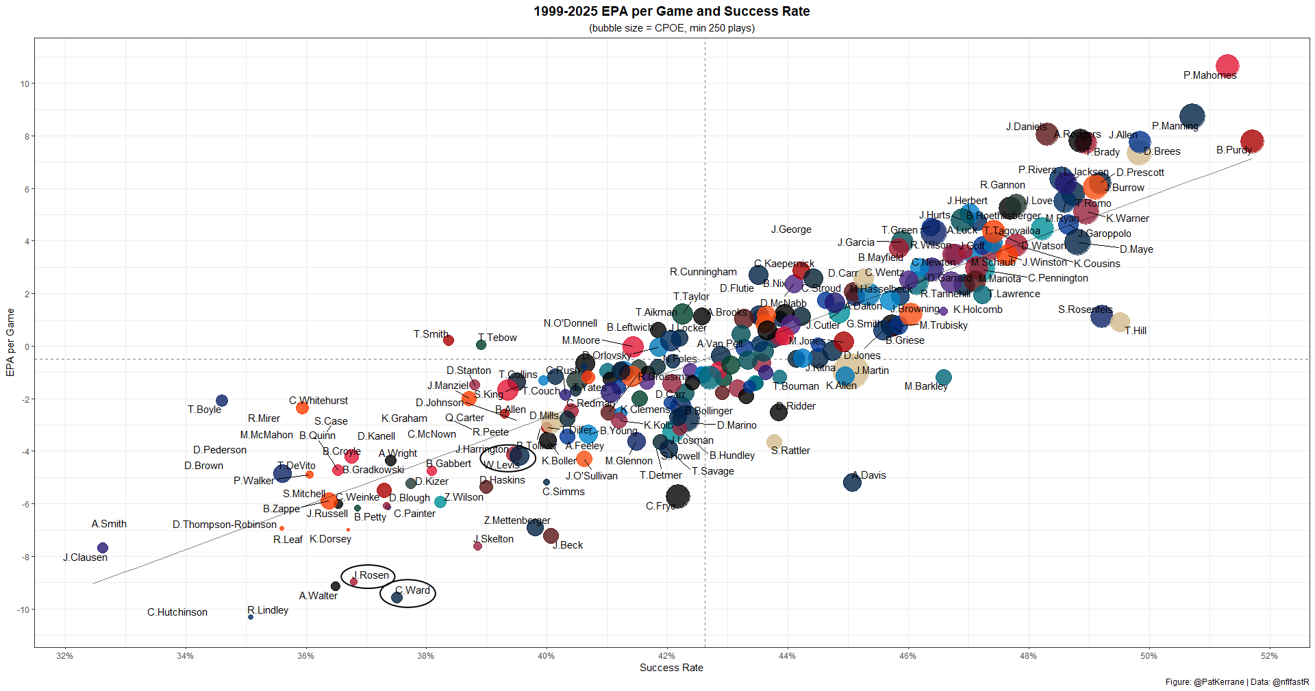Actually, in fairness to Rosen, Ward has actually been less efficient. Ward also represents a significant downgrade from Will Levis. Going all the way back to 1999, as far back as NFLfastR data is available, Ward has been about as bad as any QB on record.