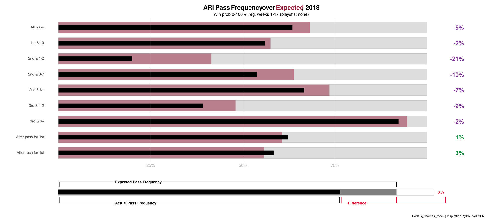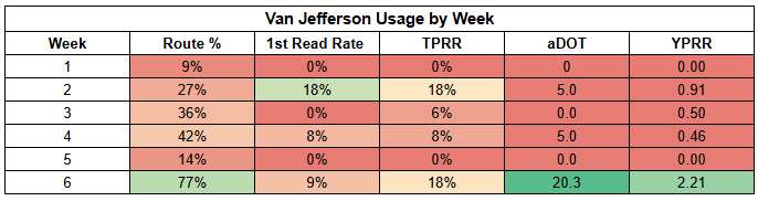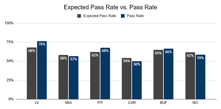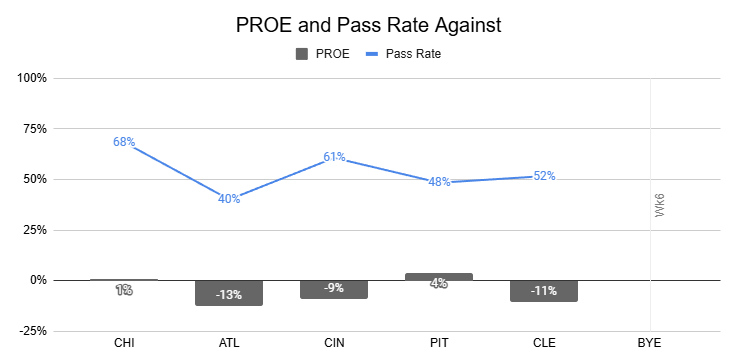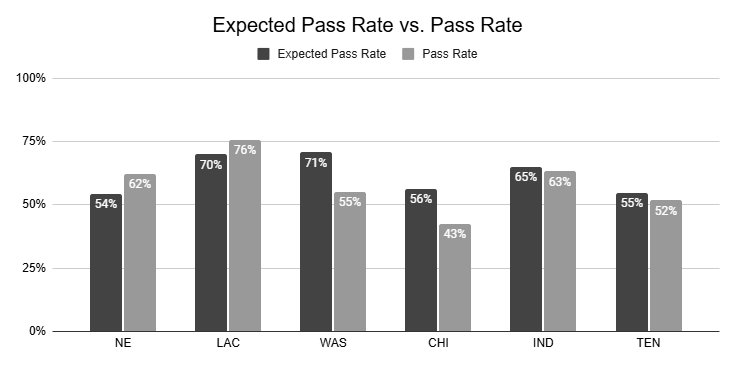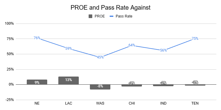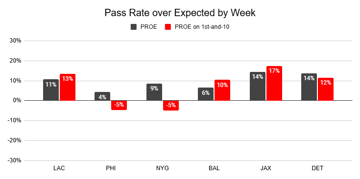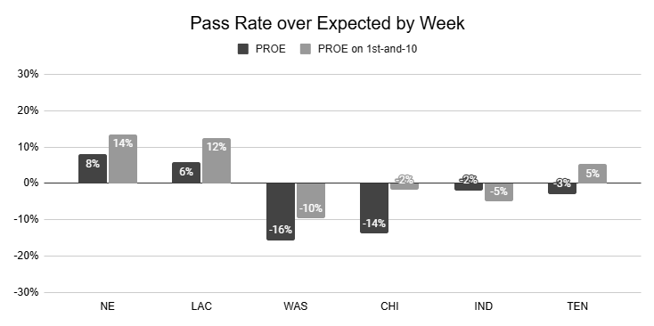The Titans have had consistently high expected pass rates—even in their Week 5 win—and have been passing nearly in line with expectations, with a -2% PROE.