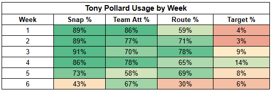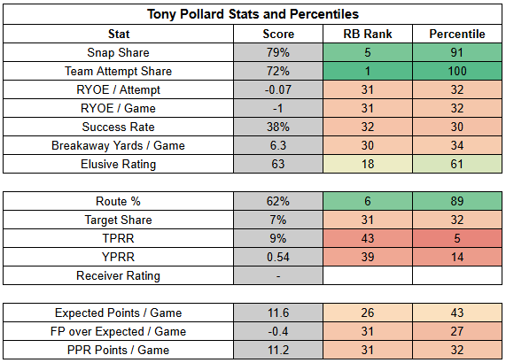 Negative game script suddenly looks like a major concern for Pollard, whose efficiency has been poor all year, and whose grip on volume is loosening. He's a TD-dependent RB3.