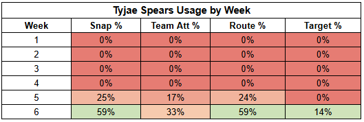 Tyjae Spears led the backfield with a 59% snap share, operating as a receiving back. Spears has just nine carries on the season. But with the Titans as 7-point home underdogs, Spears could see quite a bit of playing time again this week. He's an RB4.