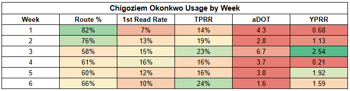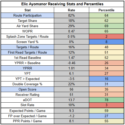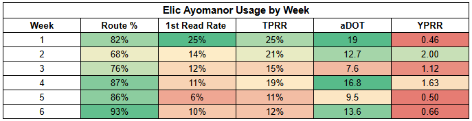 After flashing a bit in the early weeks, Ayomanor has settled into an uimpressive role with weak efficiency. Even with Ridley out, Ayomanor is just a WR4.