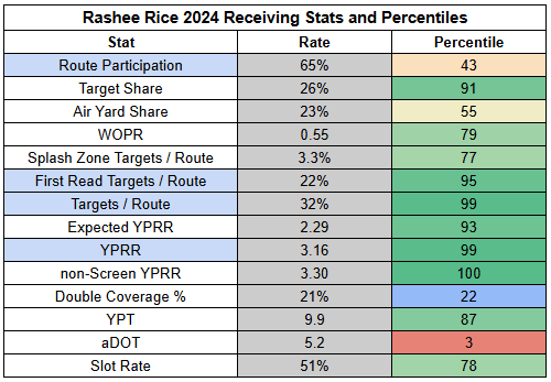 But, at the very least, Rice is likely to have a high target rate when on the field—that's kind of his thing. And even if Rice doesn't play on every dropback, there should be plenty of dropbacks.