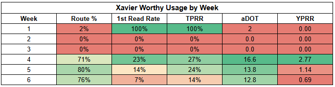 Since returning to action, Xavier Worthy has been running routes at a high rate, but his target numbers have been trending in the wrong direction. His first-read target rate is especially troubling.
