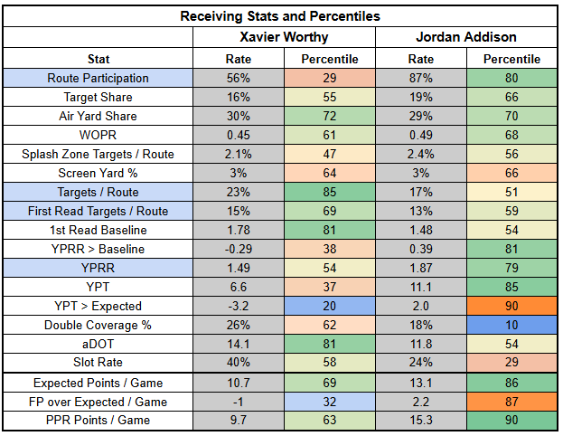 For example, his first-read target rate is better than Jordan Addison's... but it's in the same ballpark.