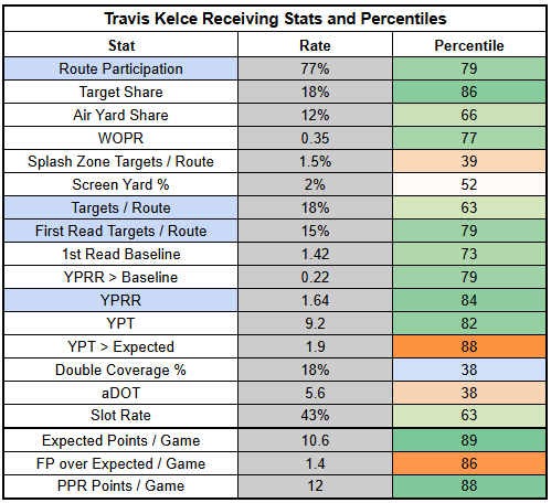 Rice's return will likely have the biggest impact on Travis Kelce, who has been seeing shallow targets over the middle of the field, where Rice does a lot of his damage. Like with Worthy, part of the bet with Kelce is that Rice starts in a part-time role. But that doesn't seem very likely. Kelce is a low-end TE1.