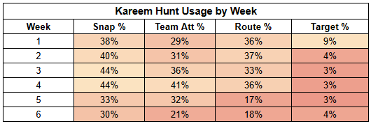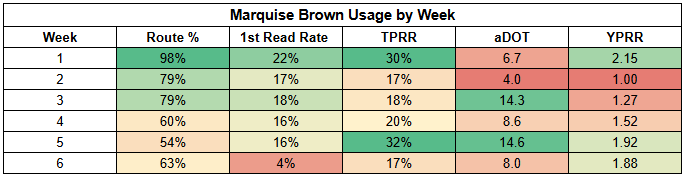 Even off of a two-TD performance, Hollywood Brown looks like a weak play this week. His route participation has fallen off in recent weeks, and his first-read target rate was down to just 4% last week.