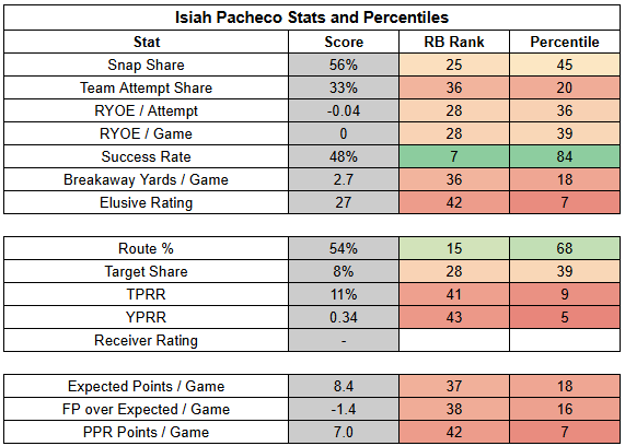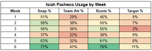 In the backfield, Isiah Pacheco is coming off his highest snap share of the year. He also dominated routes.