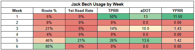Dont'e Thornton was benched last week for Jack Bech. Bech has a long way to go as a target earner, but he could be in line for some volume if Meyers sits. Bech is a contingency dart throw.