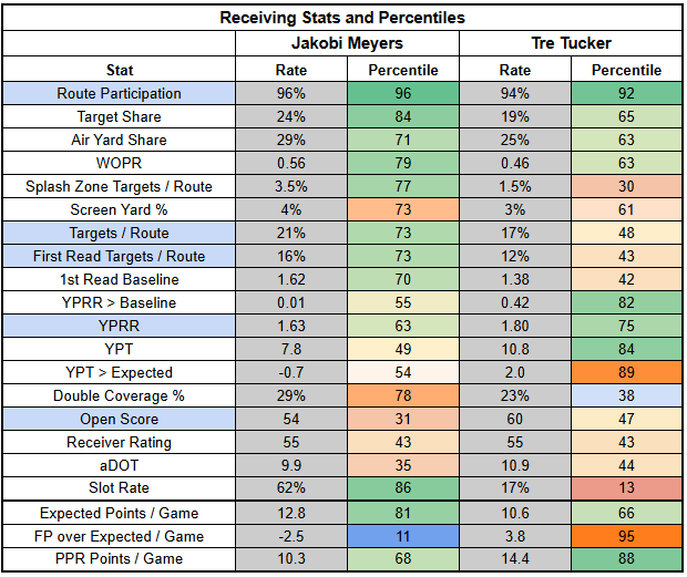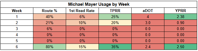Honestly, Michael Mayer might be the most interesting receiver here, for fantasy purposes. Mayer posted very strong numbers against the Titans. With just a 2.4 aDOT, he was purely an underneath accumulator. But he's an interesting way to bet on a high dropback rate. Mayer is a low-end TE1.