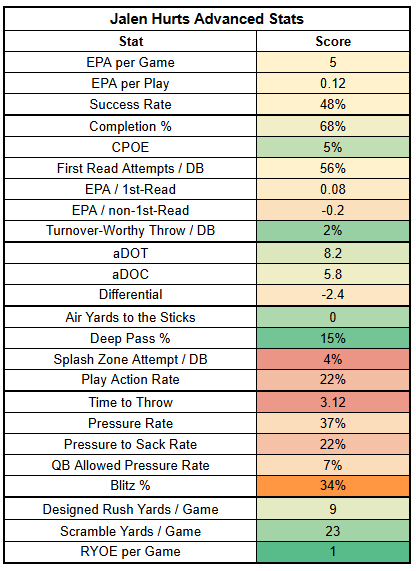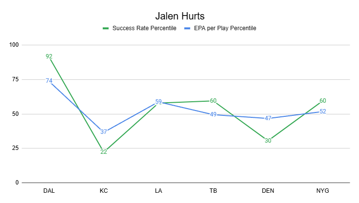 Hurts is down to just QB21 in EPA per game and QB25 in success rate. He hasn't truly been bad, just disappointing.