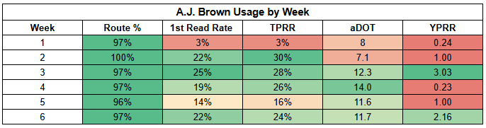 AJ Brown is coming off his second-most efficient game of the year, with a 6/80/0 receiving line. Brown has had strong target numbers in most of his games; he just hasn't been able to connect with Hurts.
