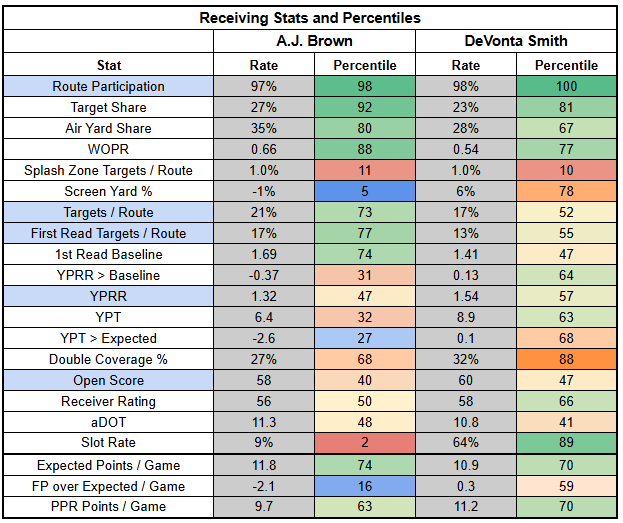 DeVonta Smith's production is more in line with this target opportunity. He's seen middling opportunity and is turning in middling production. Brown is a bet-on-talent WR2. Smith is a WR3.