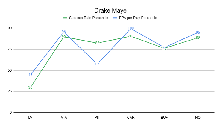 Drake Maye is coming off a very impressive performance against the Saints, turning in his third-highest marks in EPA per play and success rate.