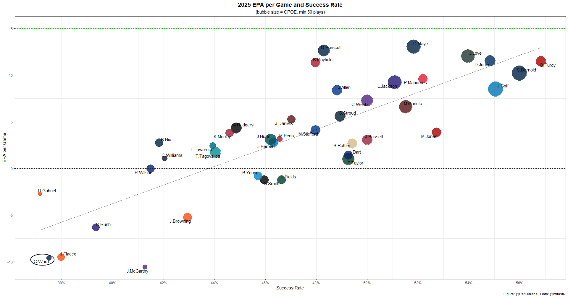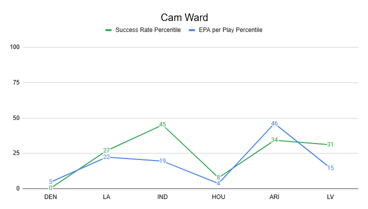 Even after facing the Raiders, one of the softest matchups in football, Ward ranks QB39 in success rate and QB39 in EPA per game.