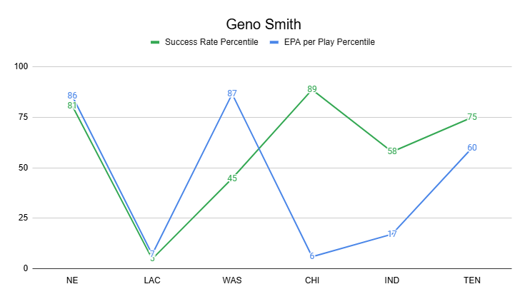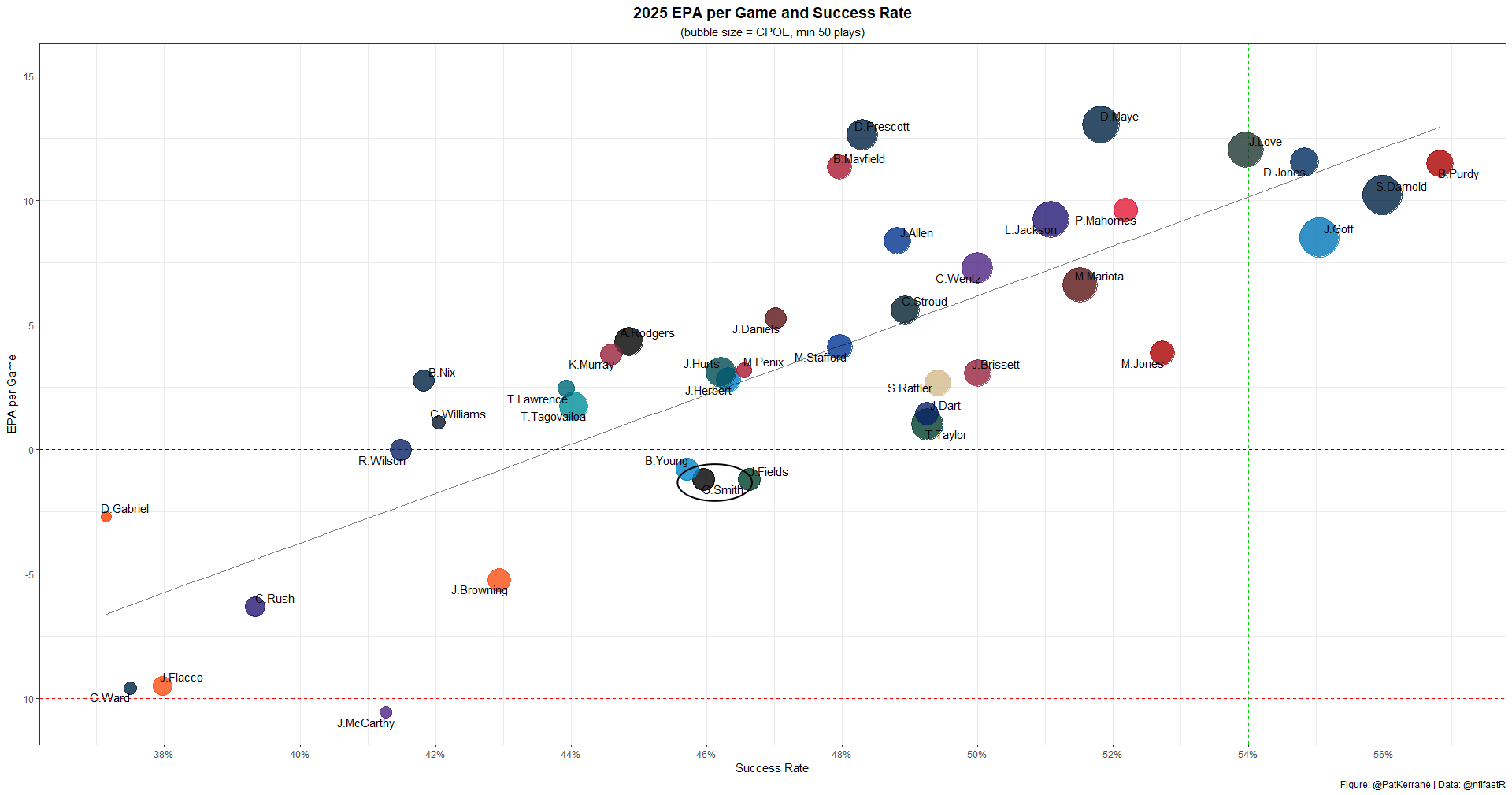 Smith has also pulled out of a tailspin and now looks like a QB whom the Raiders could justifiably bench, but who is also a minor positive regression candidate. His efficiency profile is similar to Bryce Young's and Justin Fields'.