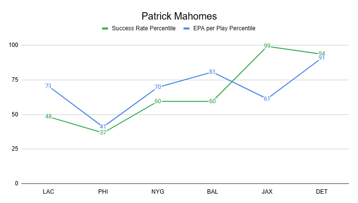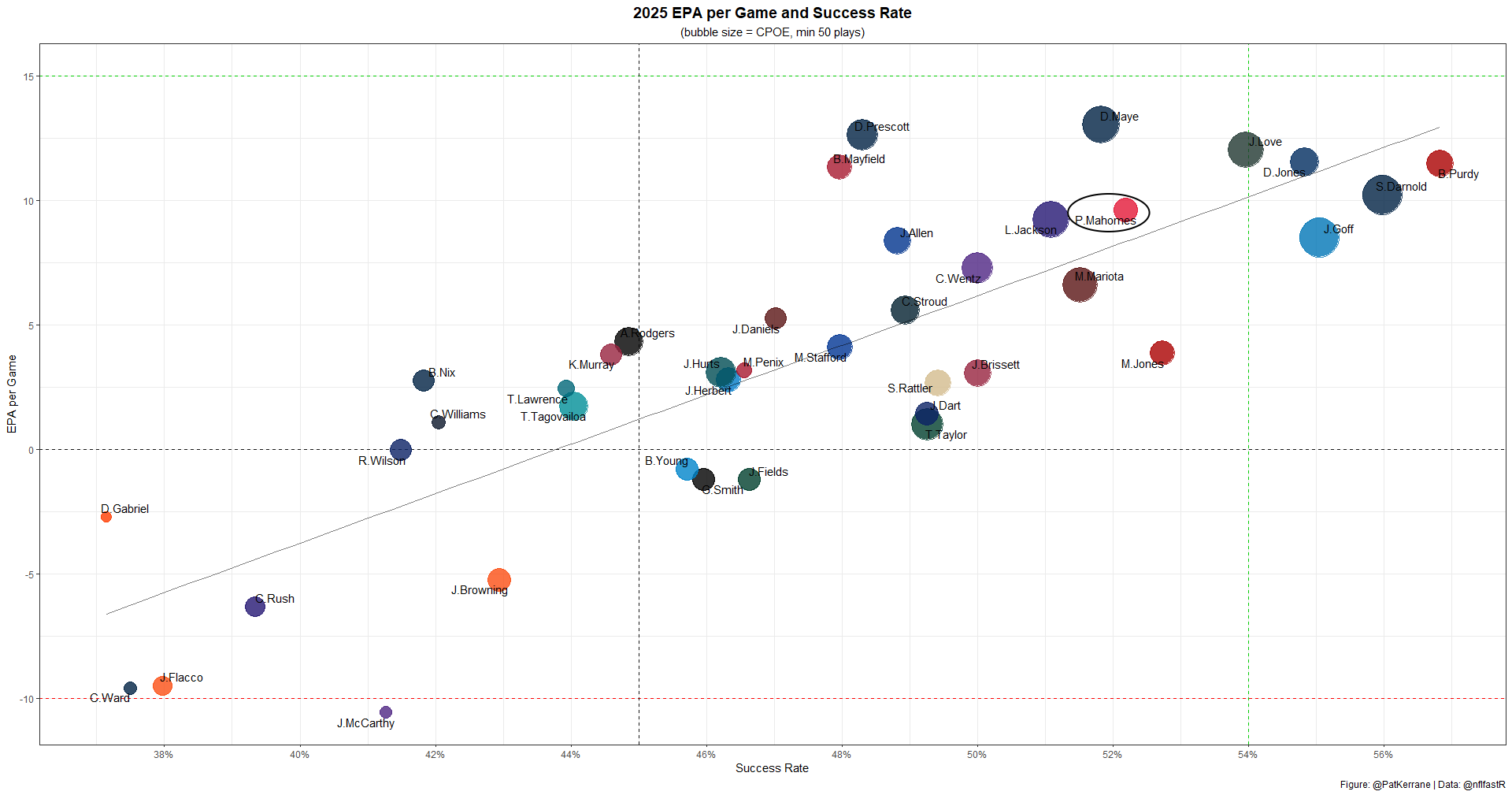 Mahomes is up to QB8 in EPA per game and QB7 in success rate. And with 9.6 EPA per game and a 52% success rate, Mahomes' 2025 efficiency is much stronger than last year, when he was at 5.5 EPA per game and a 49% success rate.