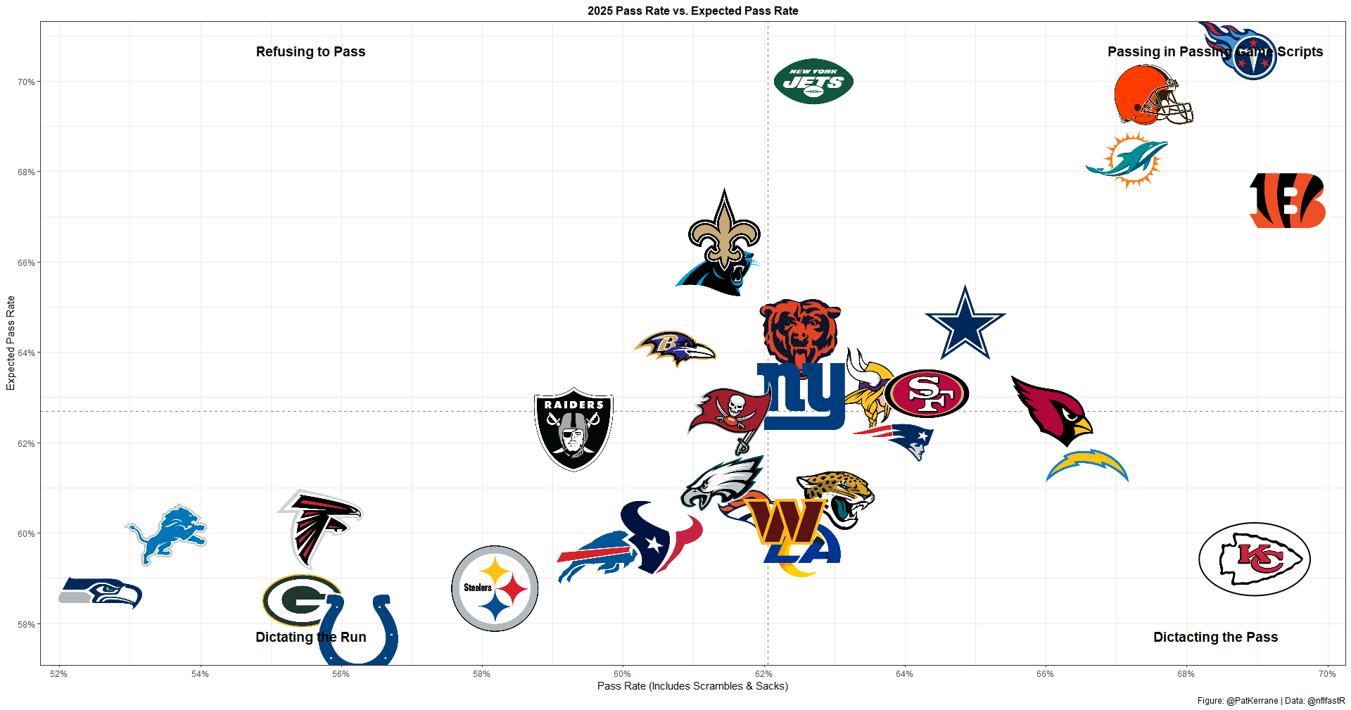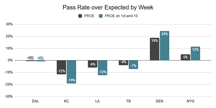 The Chiefs are back to their classic pass-heavy identity. Their 10% PROE leads the NFL and is twice that of the second-place Chargers (5%).