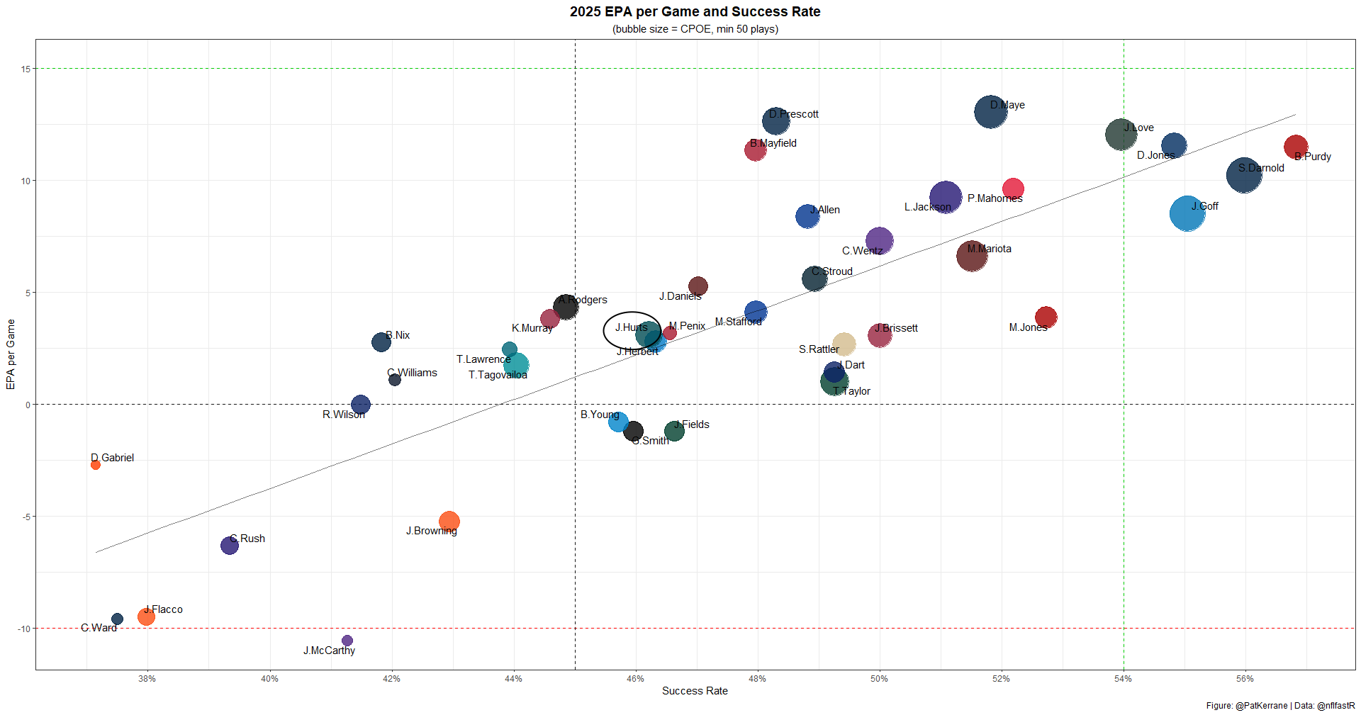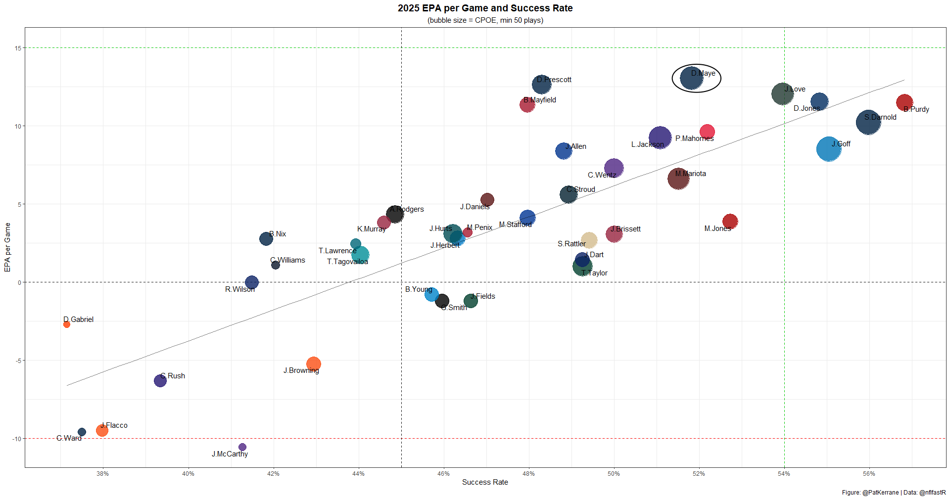 Maye is now QB8 in success rate and... QB1 in EPA per game.