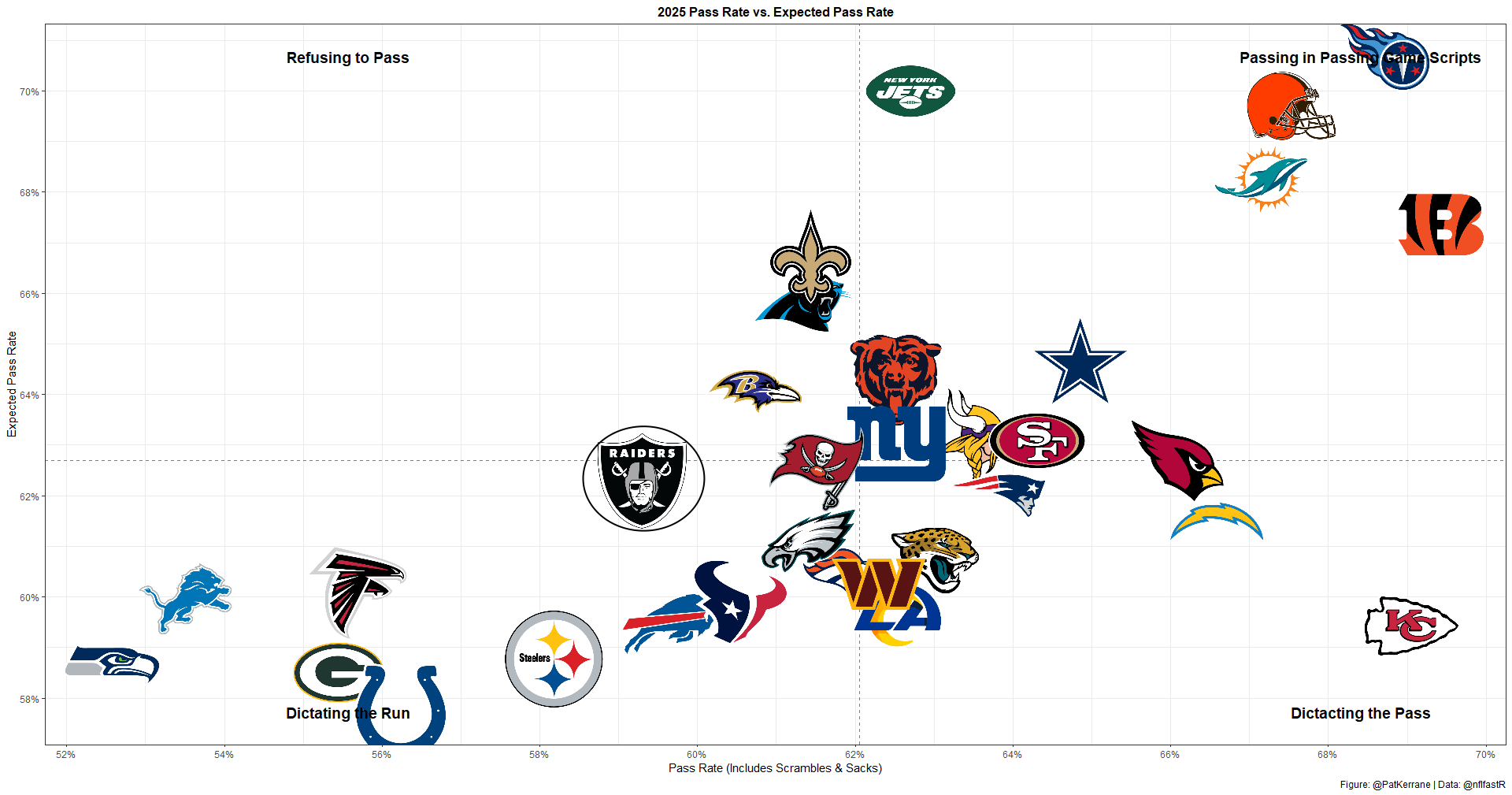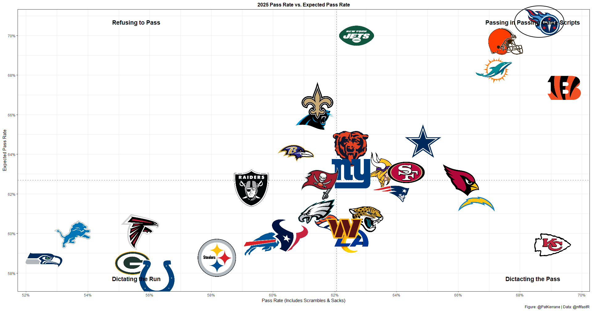 Run/pass splits are easy enough to shift quickly, which is a concern because volume is the only thing providing even a shred of value in the offense. The Titans have an expected pass rate of 71%, the highest in the league. And they've been willing to play to that extremely negative script, with a 69% pass rate.