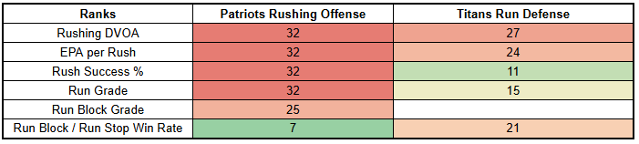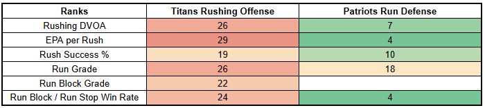 The Patriots are also quite stout against the run. They're probably more of a ton-10 unit than a top-5 one. But this is still a tough team to run on, threatening to make the Titans one-dimensional. Landry has been much less impactful in the run game than as a pass rusher, so his absence shouldn't have much of an impact on this part of the matchup.