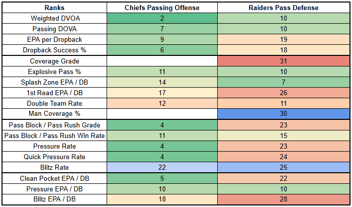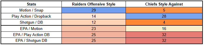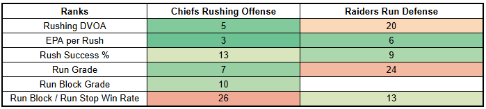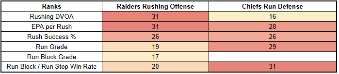 That's not ideal, considering the Raiders are among the least efficient rushing teams in the league. The Chiefs haven't been great against the run, but with Patrick Mahomes captaining the 11.5-point home favorites, a run-heavy attack is unlikely to lead to victory.