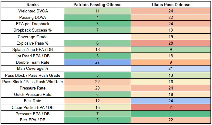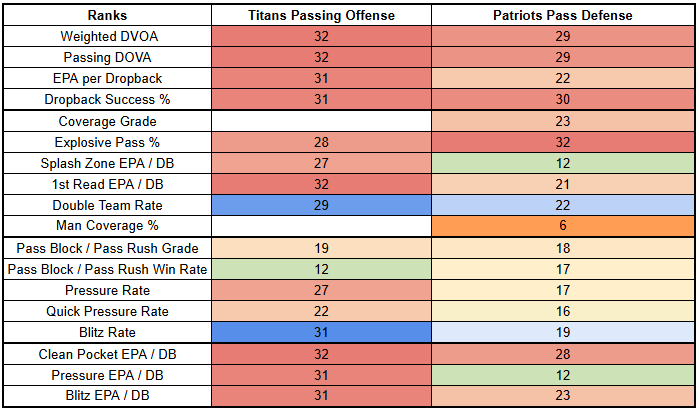 The good news for the Titans is that the Patriots will likely be without Harold Landry, who ranks 17th in pass rush win rate and has been a difference maker at EDGE. So, while the secondary is better than it looks on paper, the pass rush is worse.