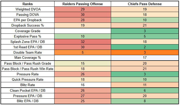 This week, Smith faces a Chiefs secondary that is covering extremely well. The Chiefs also pressure at a high rate, which is a problem for the Raiders' offensive line, which still has star LT Kolton Miller on injured reserve.