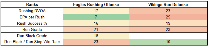The Eagles now get a Vikings defense that is awesome against the pass, but pretty weak against the run.