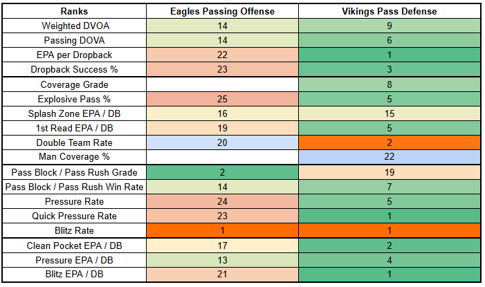 Hurts needs a slump-busting matchup. What he gets instead is the Vikings' elite pass defense. The Vikings blitz at the highest rate in the NFL and are the most efficient blitzing team. Hurts is going to need to get the ball out quickly this week.